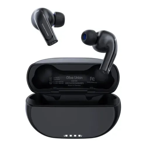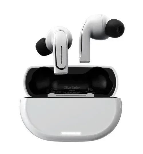 The Olive Pro is a two-in-one device combining hearing aid functionality with true wireless earbuds, featuring a classic earphone design that rests against the earlobe.