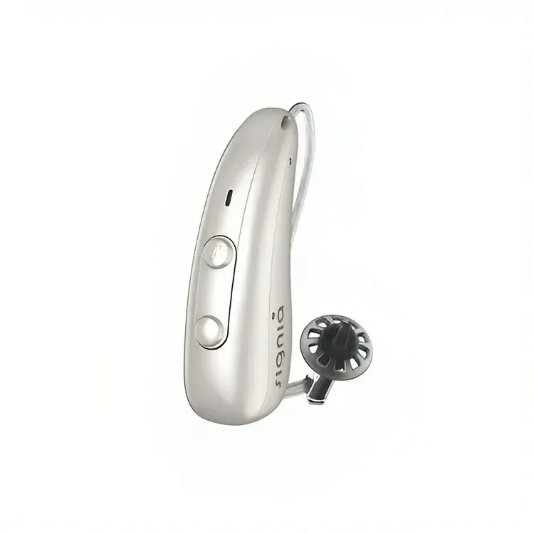 The 2023 model introduces beam-forming technology for multiple speakers and Own Voice Processing (OVP) to reduce self-voice amplification discomfort. Unlike competitors requiring custom ear imprints, Signia uses Click Sleeves for instant fit.